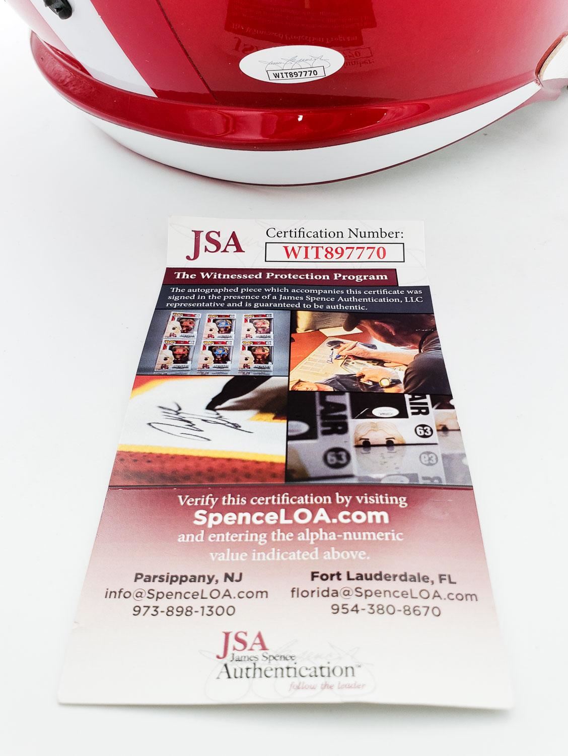 This autographed full size replica helmet has been personally hand-signed by Terrell Owens of the San Francisco 49ers. This autograph is certified by James Spence Authentication's (JSA) Witnessed Protection Program. That means that a JSA representative was present when this item was signed. It comes with the numbered hologram and matching Certificate of Authenticity.