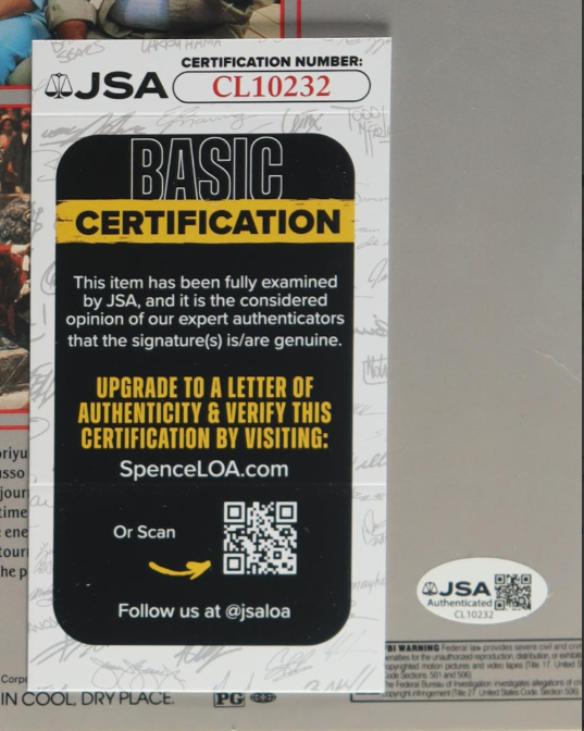 This collectible features a "The Karate Kid Part II" Laser Video Disc personally signed by William Zabka. Perfect for fans and memorabilia collectors, this rare item showcases Zabka’s authentic autograph, verified by James Spence Authentication (JSA) to ensure its legitimacy. The Laser Disc format highlights this iconic film in a unique vintage medium, making it a standout piece for any collection. Whether displayed or preserved, this signed Laser Video Disc captures a memorable moment from the beloved Karate Kid series, offering a valuable keepsake for enthusiasts of classic cinema and martial arts history alike.